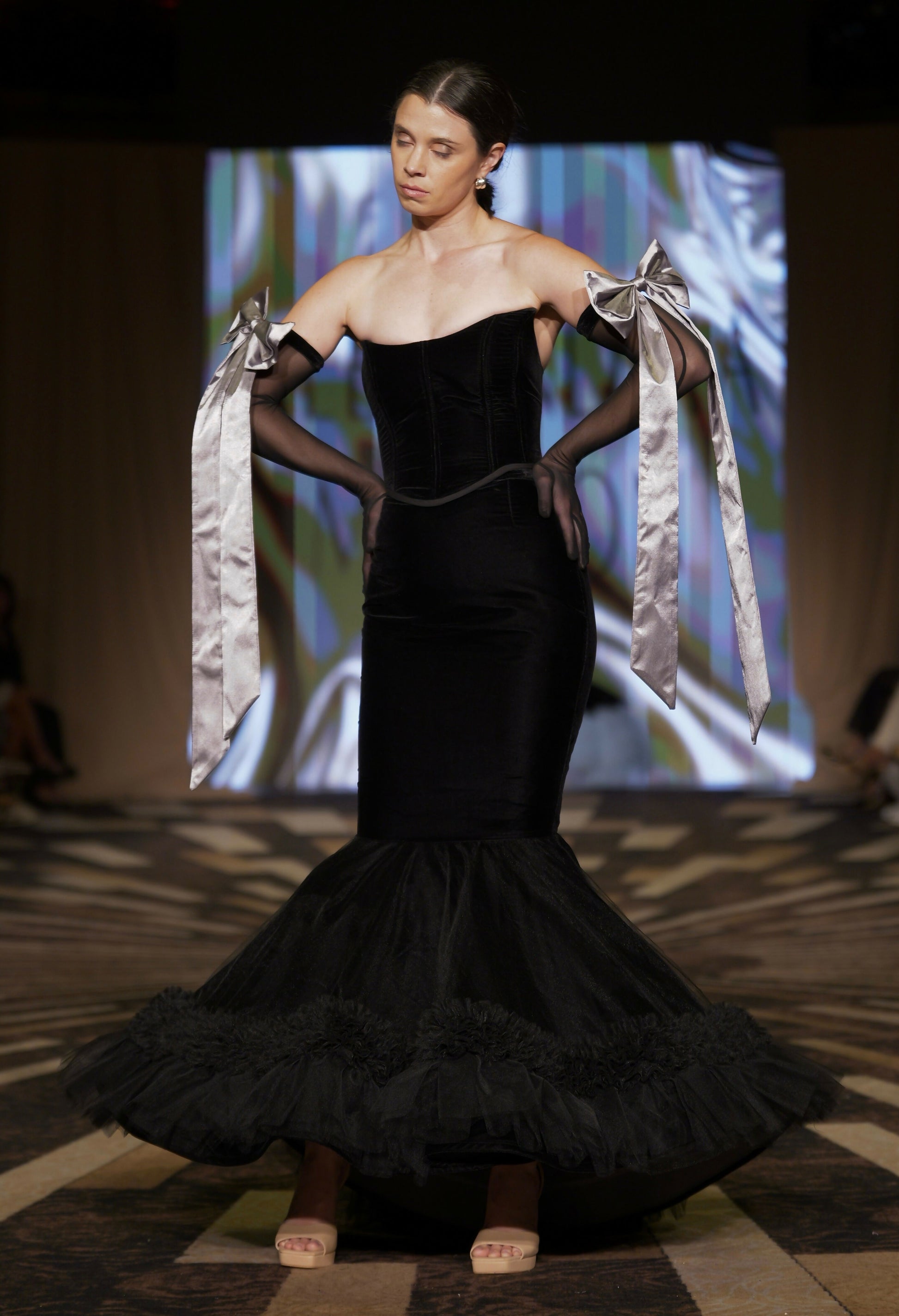 A vision sculpted in black velvet, this gown embraces the body with the strength of a corset and the grace of a mermaid's silhouette. The skirt unfurls into a cascade of tulle ruffles, whispering movement with every step. Sheer gloves, finished with silk bows, add a final touch of ethereal romance. An ode to eternal elegance, Éternelle Ombre embodies the mystery and allure of shadow brought to life.
