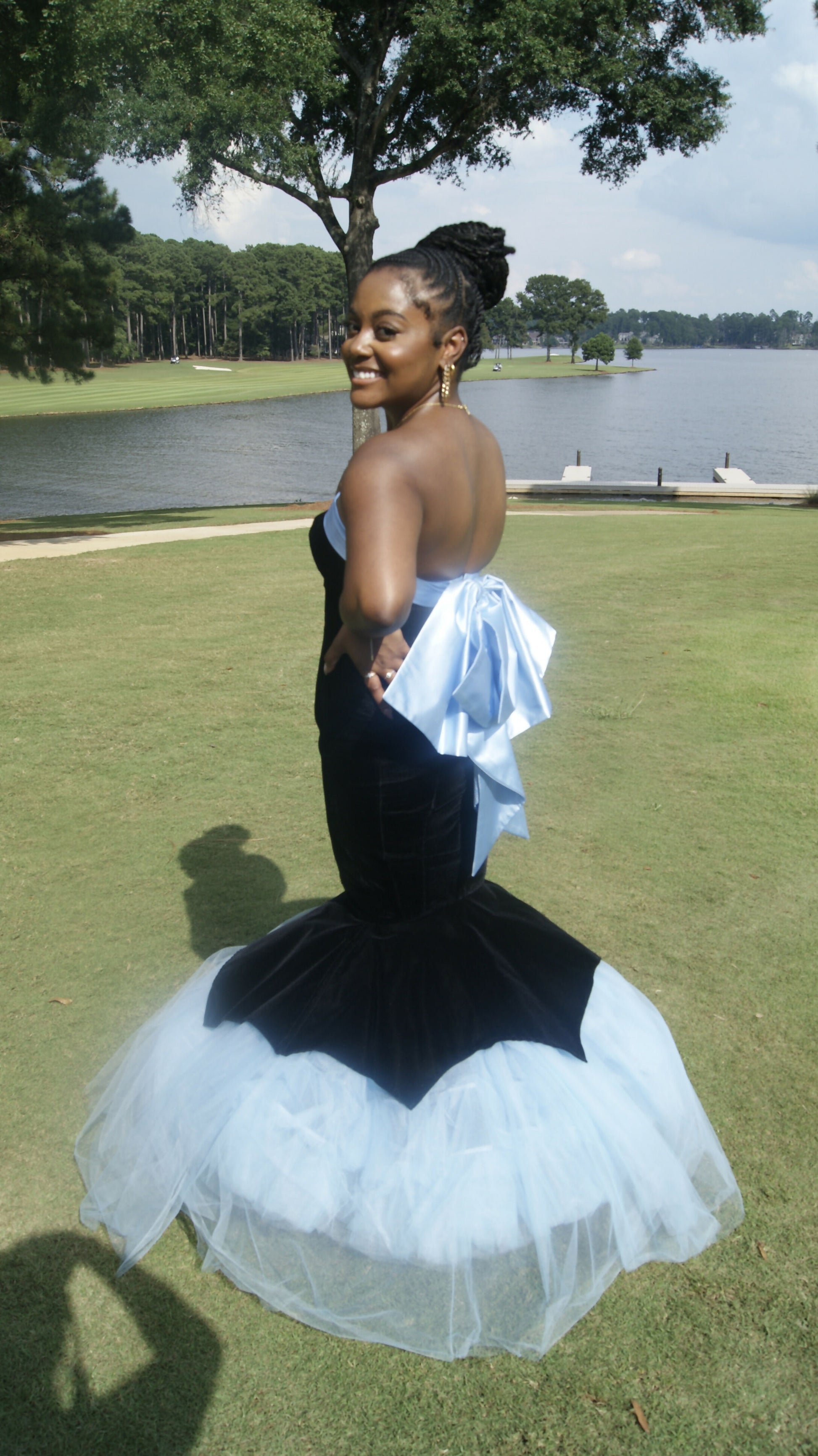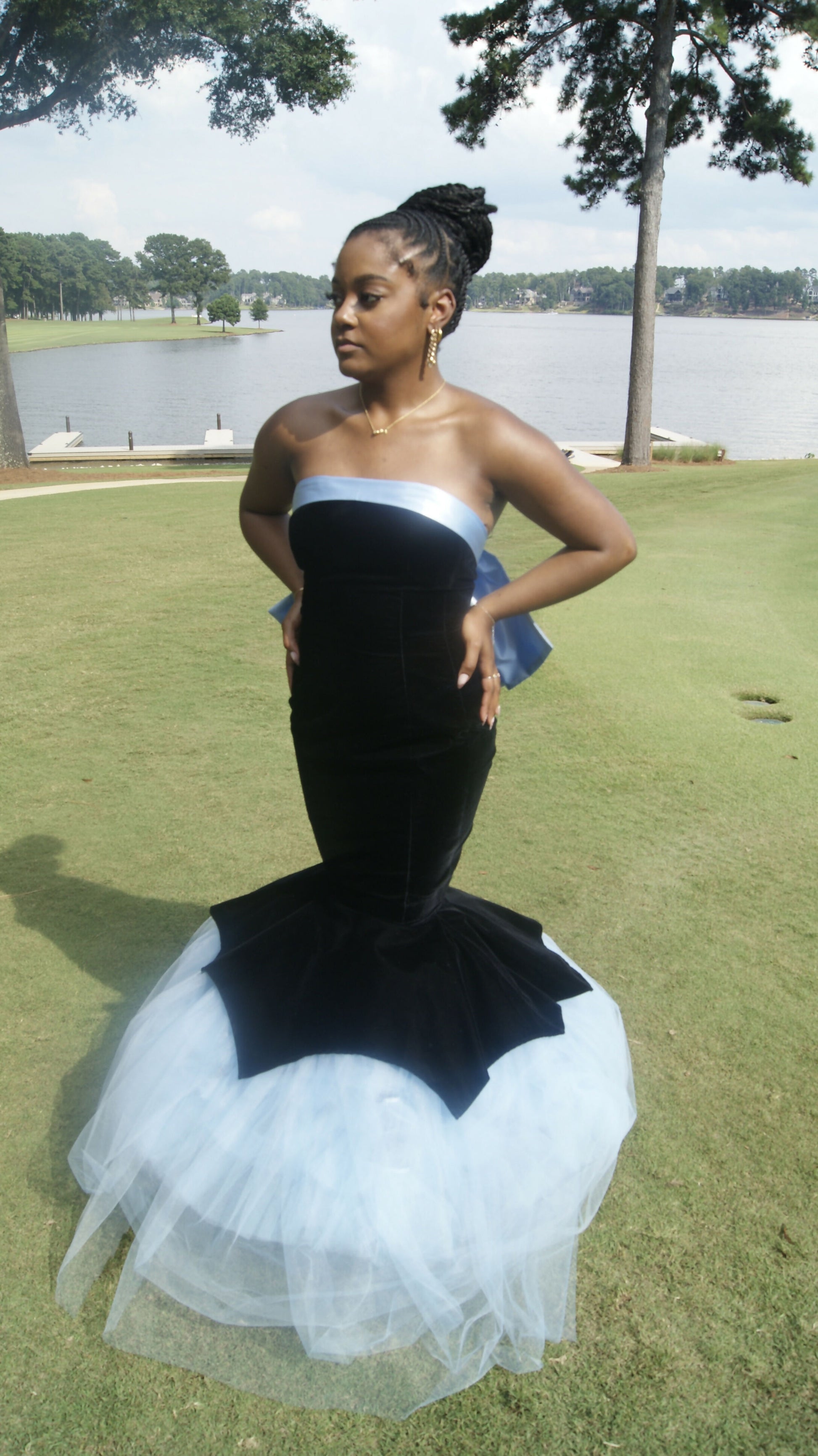 Dramatic yet effortlessly elegant, this strapless black velvet mermaid gown embodies timeless sophistication with a contemporary twist. The gown's fitted silhouette flows seamlessly into an umbrella-style hem, paired with a voluminous sky-blue petticoat, creating a striking contrast that captures movement and light. A delicate blue silk band crowns the strapless neckline, accentuating the shoulders, while a silk bow at the back adds a touch of whimsical femininity. Perfect for elegant evenings, gala events, or any occasion where statement-making glamour is required, this gown is a celebration of bold elegance and refined craftsmanship.