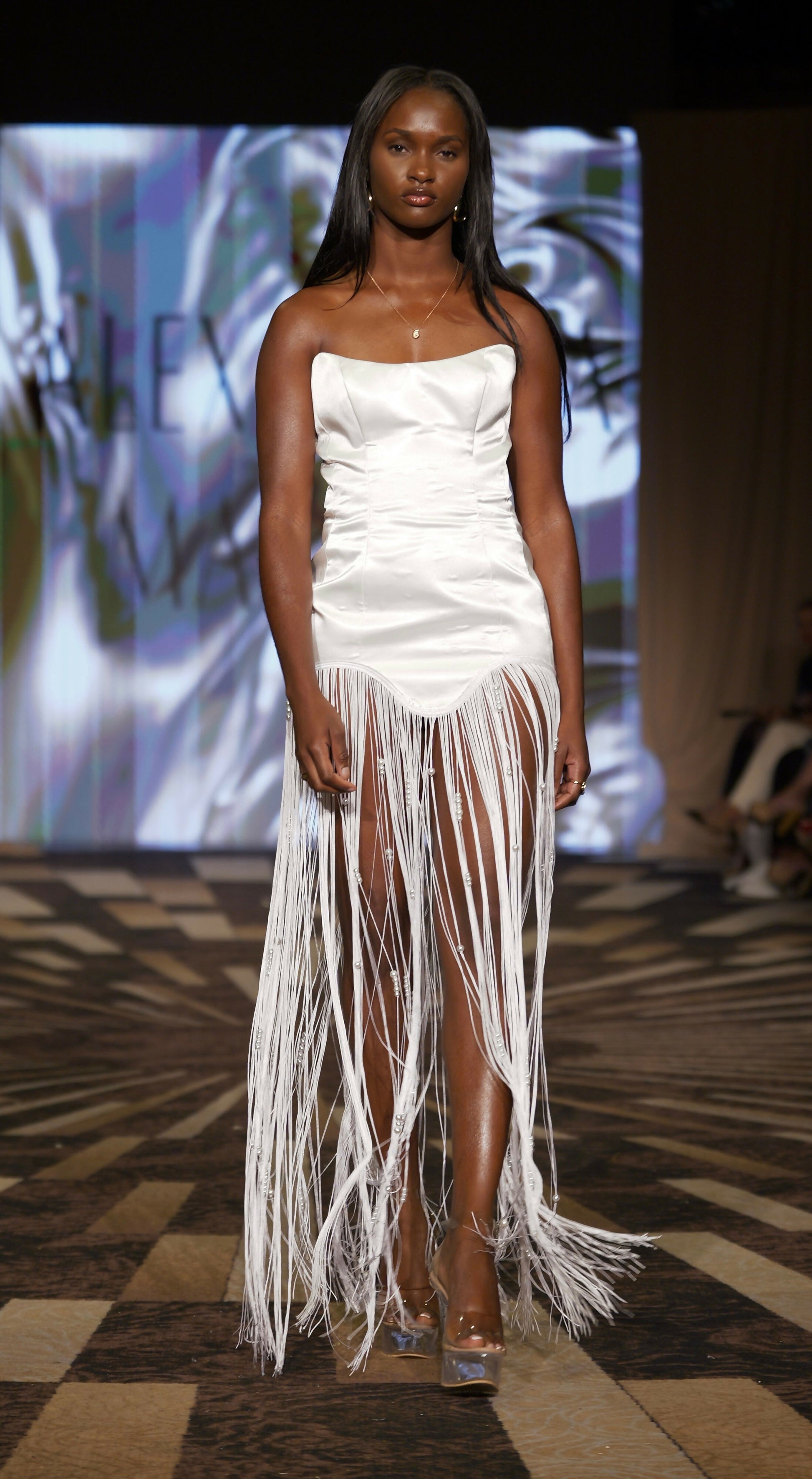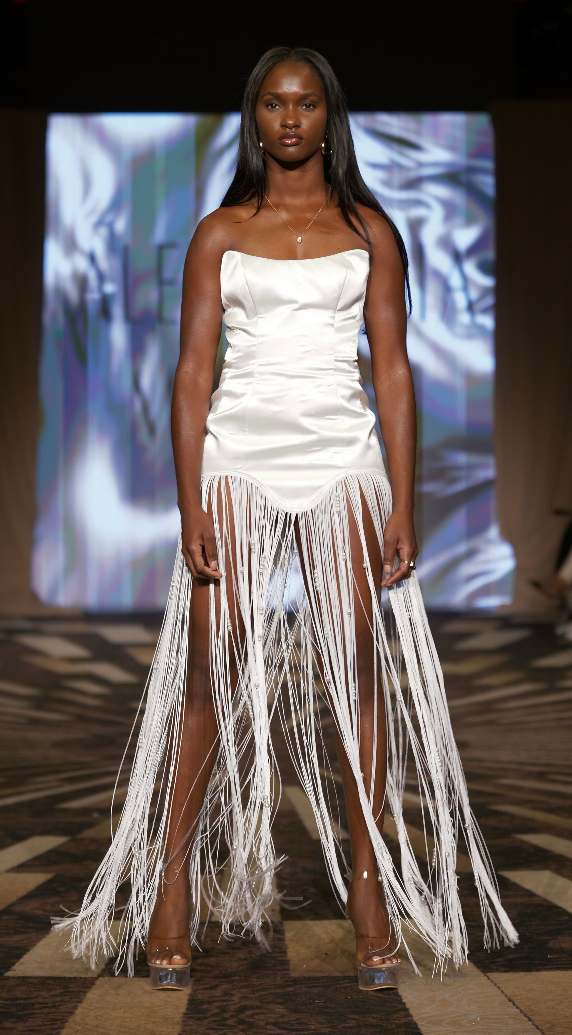 Make a statement in this Alexandria Marrón strapless mini corset dress, where modern elegance meets couture craftsmanship. The fitted silk corset showcases a delicate scalloped hem, meticulously hand-embellished with pearls. From the hem, layers of flowing fringe cascade to the floor, some strands adorned with pearls for a touch of glimmer and movement. This striking interplay of texture, light, and shape creates a captivating silhouette perfect for appearances, galas, or unforgettable evening moments.