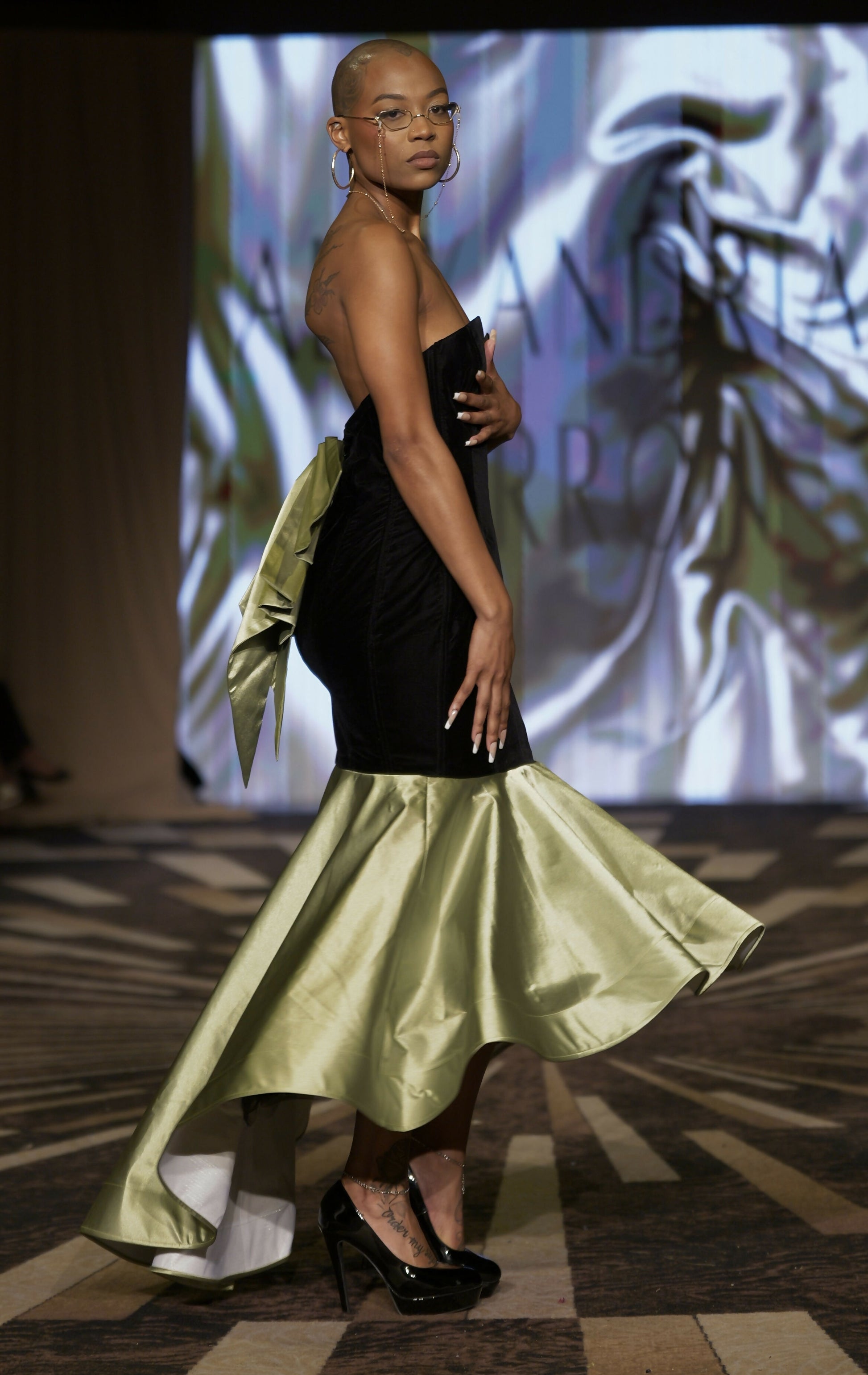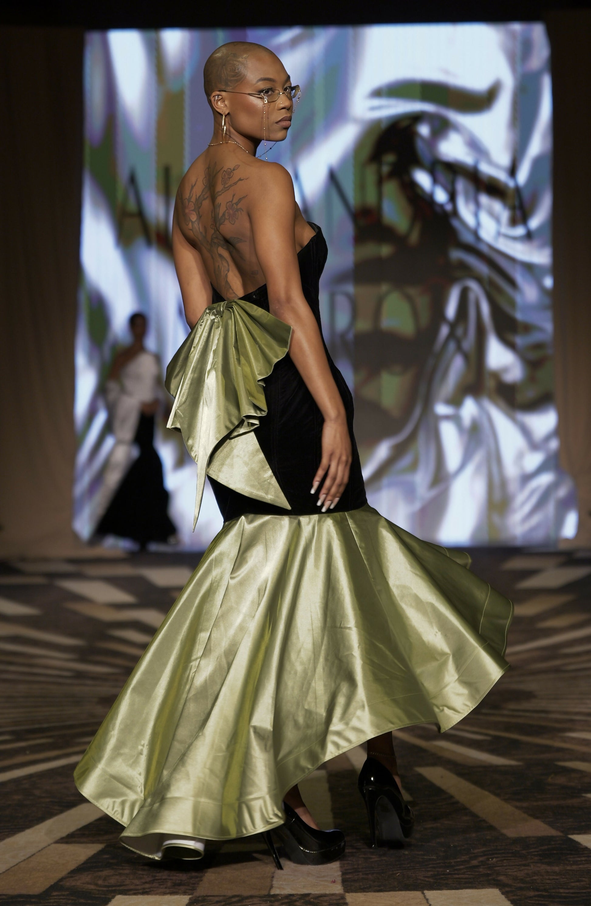 Step into a world of bold elegance with this Alexandria Marrón masterpiece. The gown features a strapless black velvet corset body with a daring deep plunge neckline, sculpting the figure with dramatic precision. Fitted through the knee, the silhouette transitions into a flowing high-low mermaid skirt in luminous silk chartreuse, creating a striking contrast and graceful movement. At the back, a silk chartreuse bow adds a touch of playful sophistication, making this statement piece perfect for unforgettable evenings.