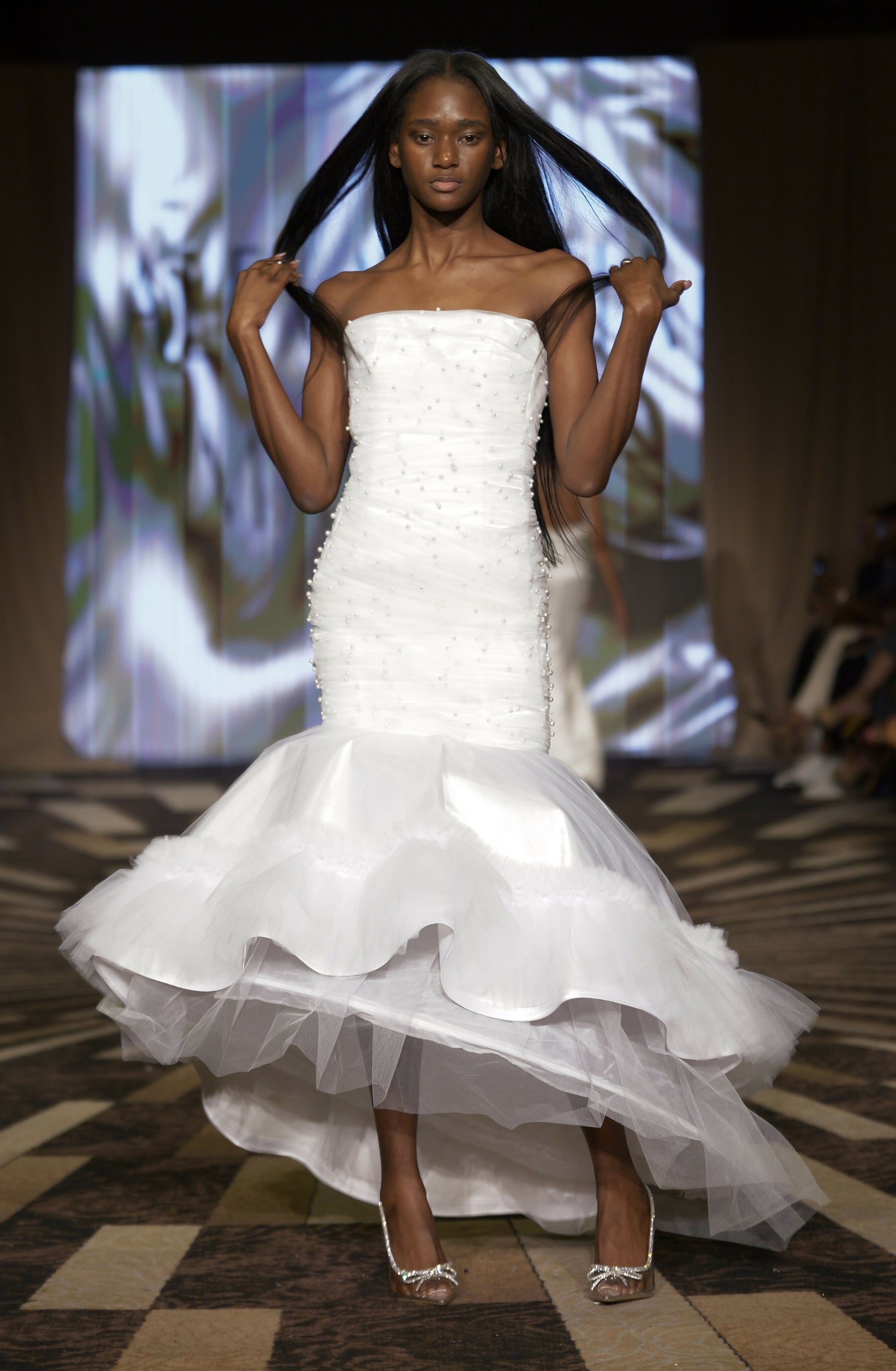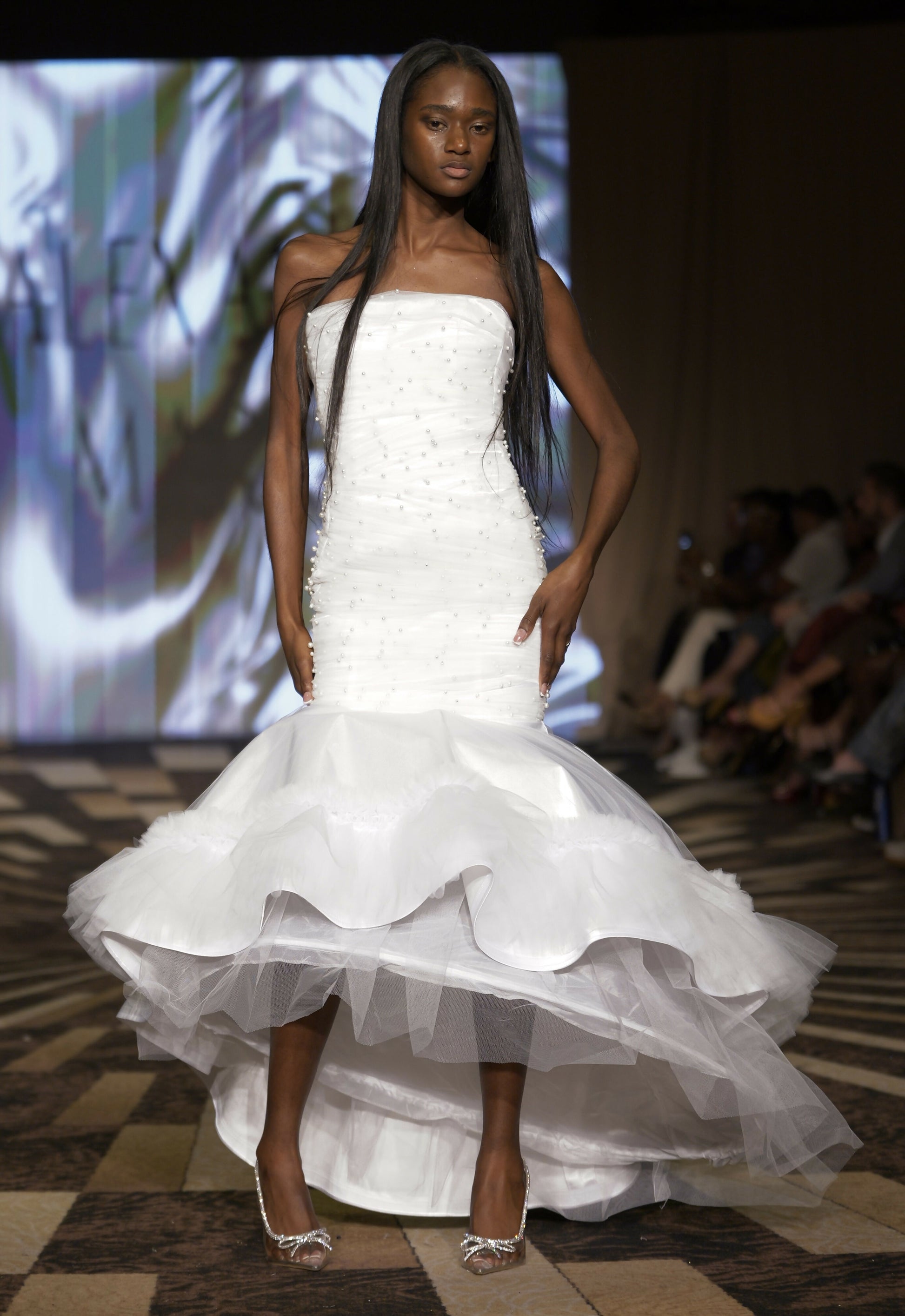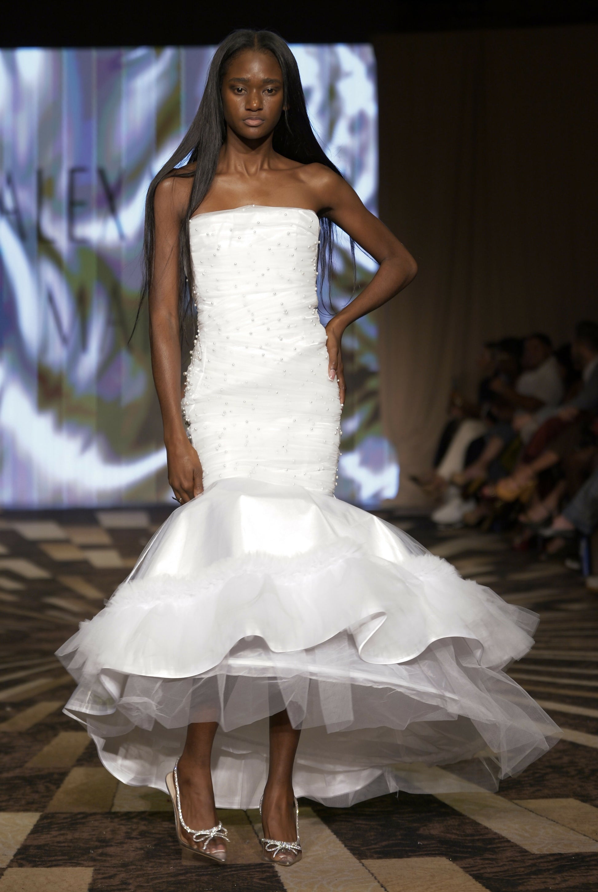 With this gown, Alexandria Marrón elevates elegance to an art form. The top features a pure white silk dress body, overlaid with hand-draped pearled tulle, each meticulously sewn to create a sculptural, ethereal effect. The silhouette flows into a high-low mermaid skirt crafted in white silk, accented with a soft tulle overlay and ruffled tulle hem for romantic movement. Every detail reflects couture craftsmanship, making this gown a timeless statement of refinement and grace.