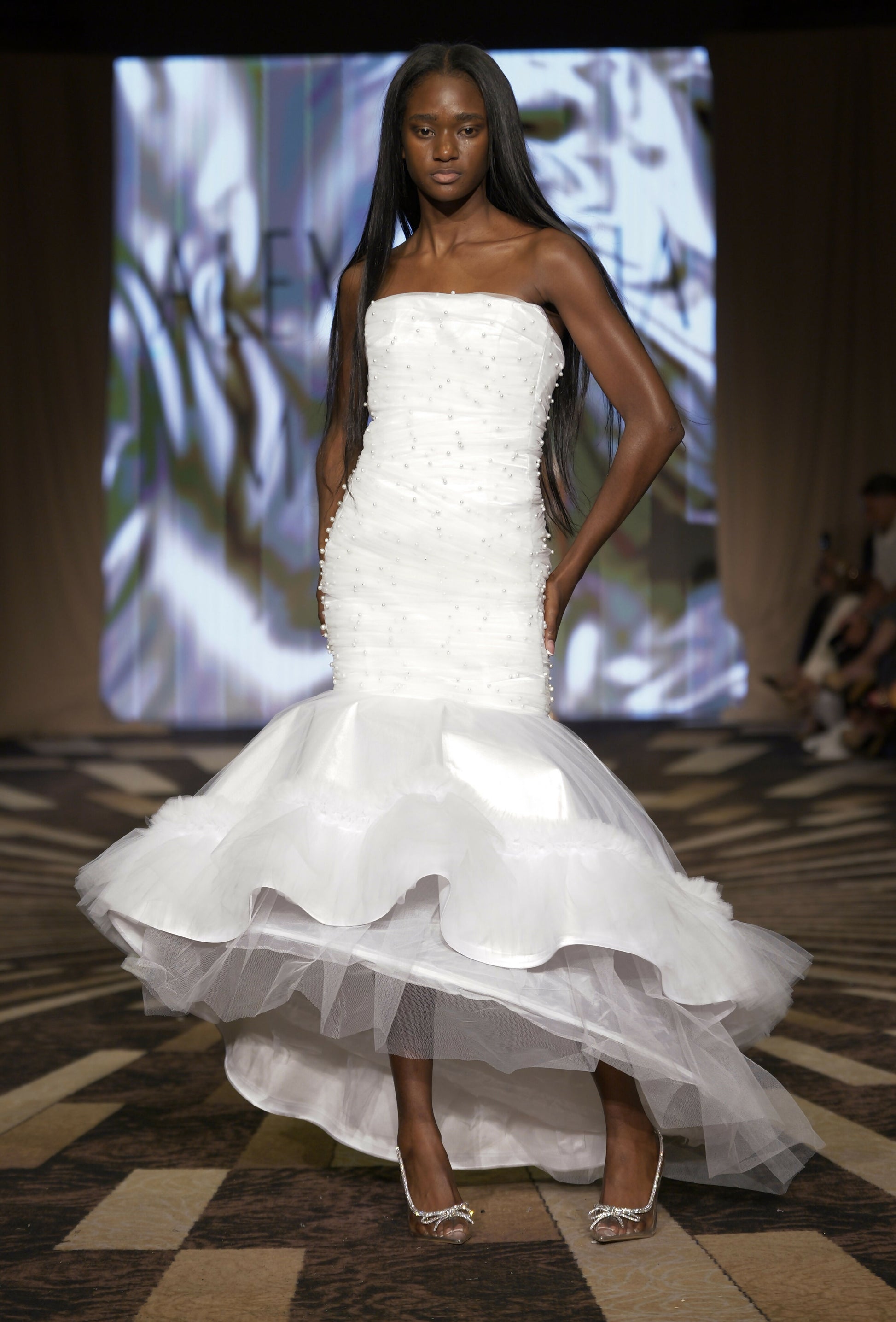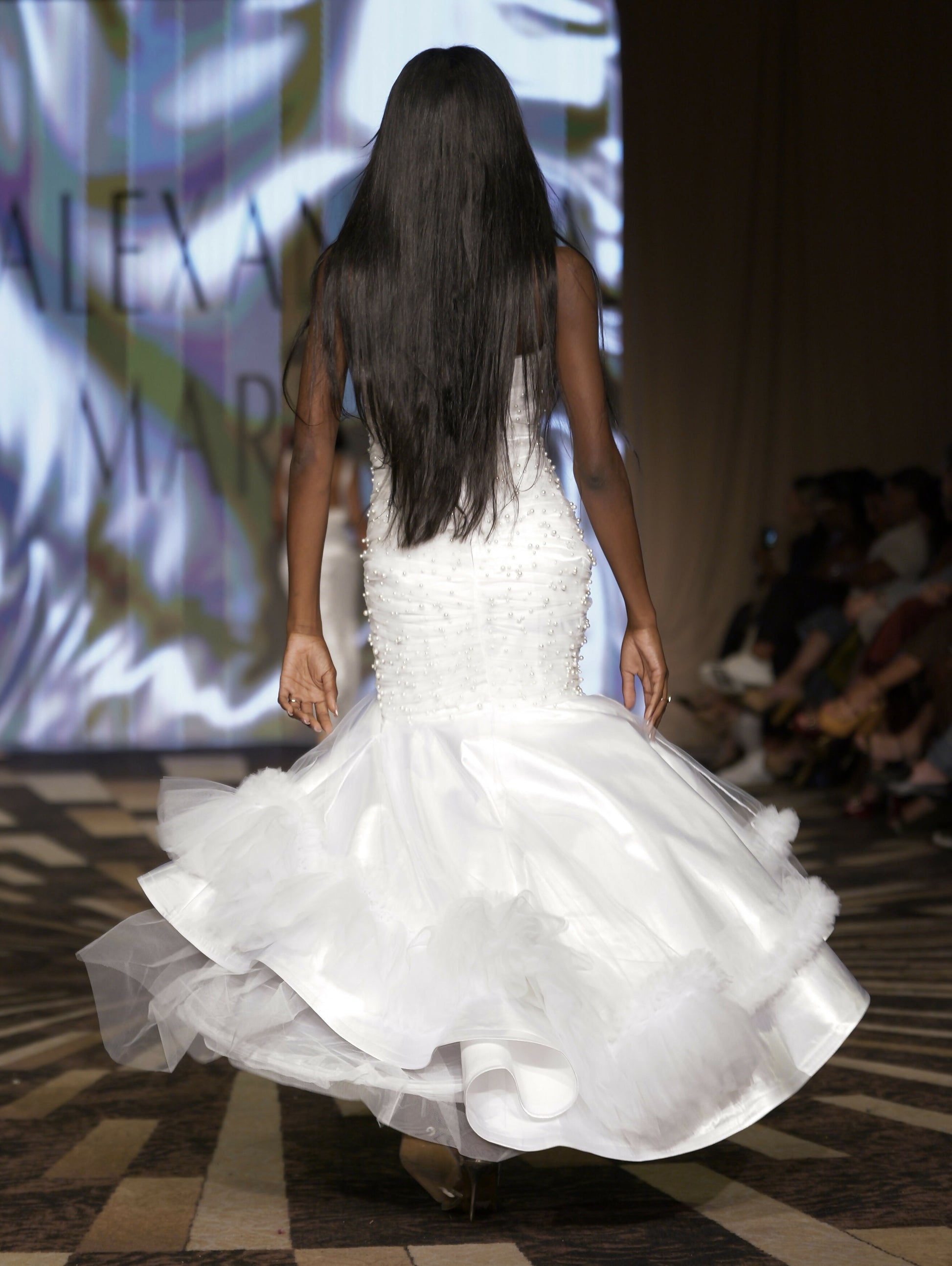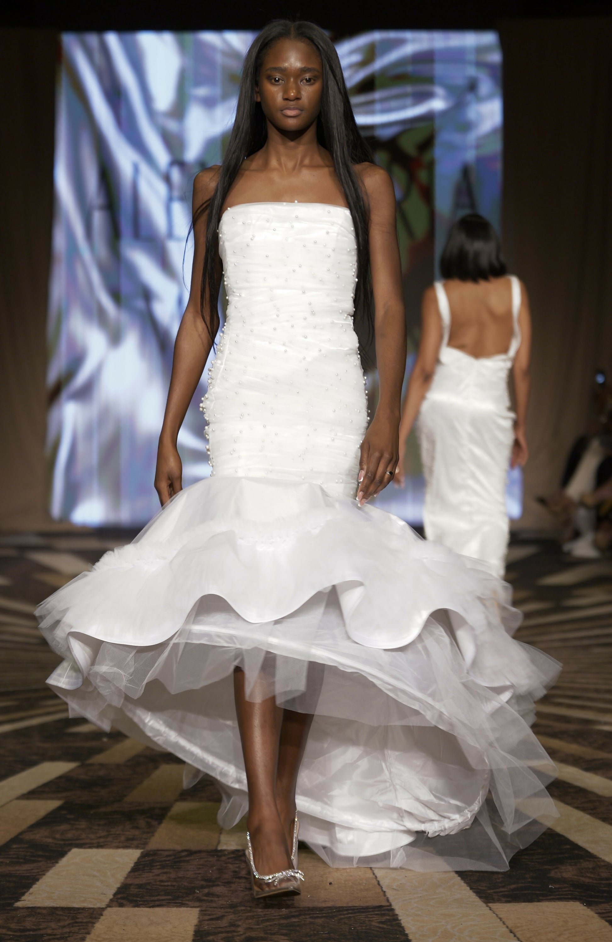 With this gown, Alexandria Marrón elevates elegance to an art form. The top features a pure white silk dress body, overlaid with hand-draped pearled tulle, each meticulously sewn to create a sculptural, ethereal effect. The silhouette flows into a high-low mermaid skirt crafted in white silk, accented with a soft tulle overlay and ruffled tulle hem for romantic movement. Every detail reflects couture craftsmanship, making this gown a timeless statement of refinement and grace.