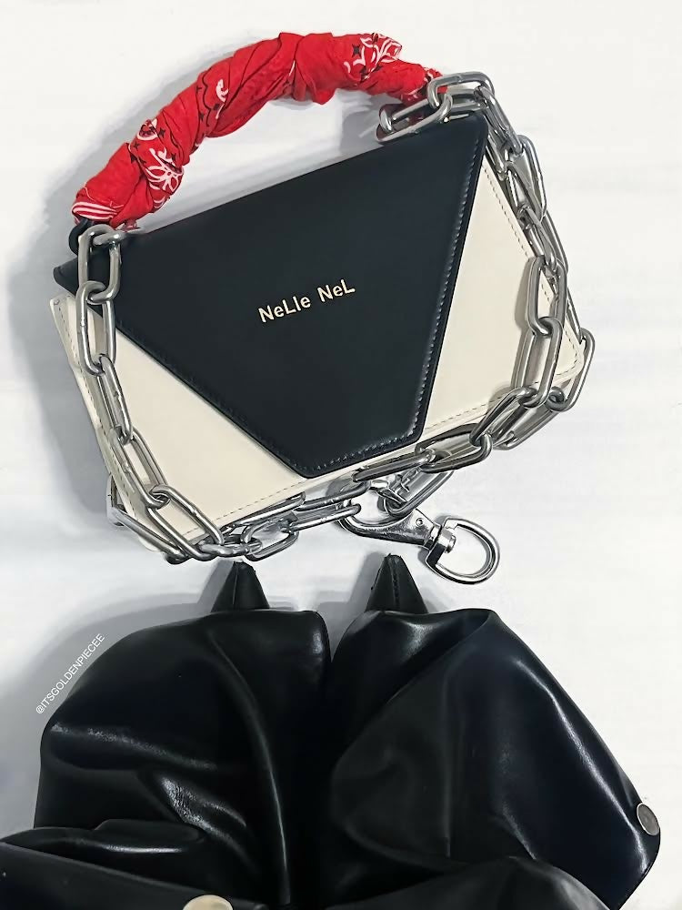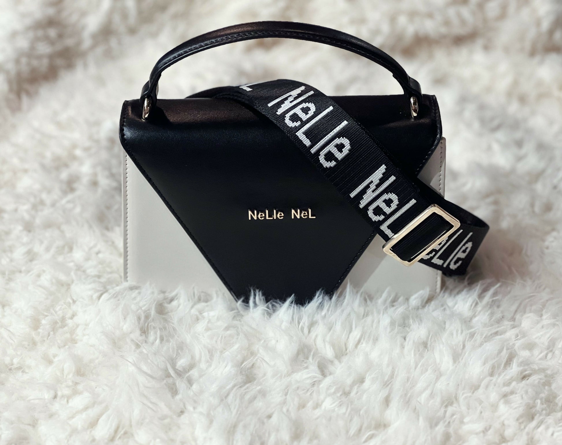 Made from real genuine leather, small black and white with gold finishings, and a black webbing strap with the brand name in white. additional Inside zipper pocket and inside frontside pocket.